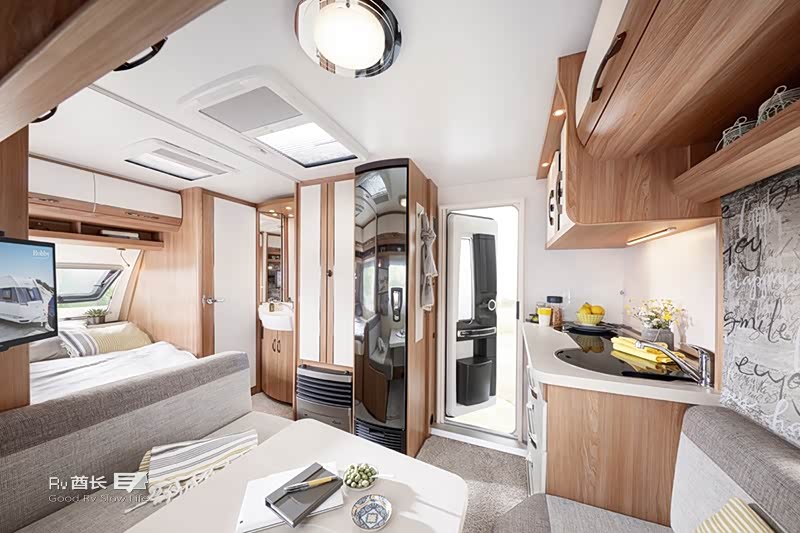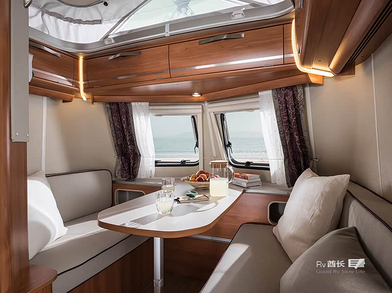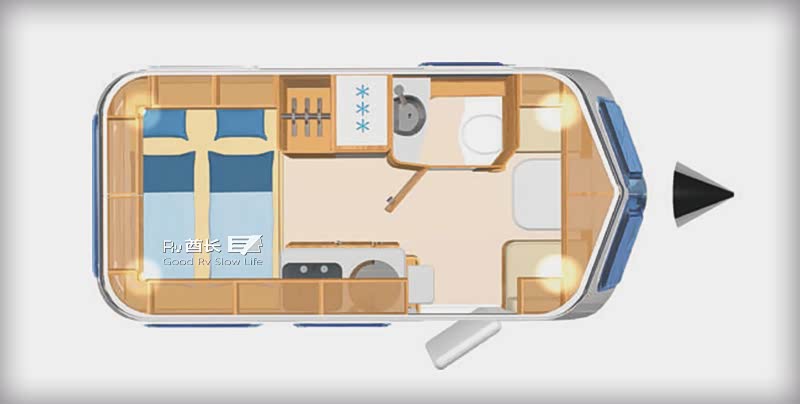 Hobby豪彼 DE LUXE 400 SFe外部轮廓尺寸为5.96*2.3*2.63米,整备质量为1080kg。6米左右的尺寸,同样提供了法式床的布局。这种布局可以搭配干湿分离卫浴间(独立洗漱台),拥有更加舒适的使用环境。起售价为17780欧元