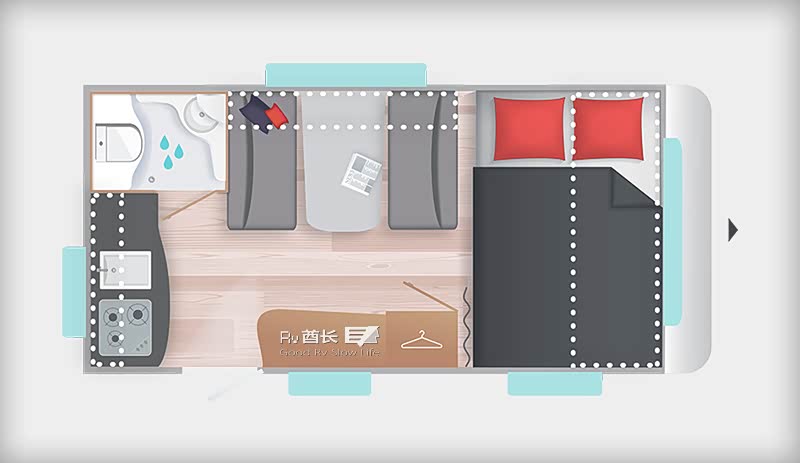 STARLETT COMFORT 420CP外轮廓尺寸为5.9*2.1*2.58米。从车尾部一上门的地方是厨房及卫浴间;车头提供了一张双人床(横床)140×195cm;中间是对桌沙发(可转换为睡眠区100x170cm)。420CP整备质量仅为870KG,经典的欧洲一体式卫浴间提供淋浴花洒。起售价为15880欧元