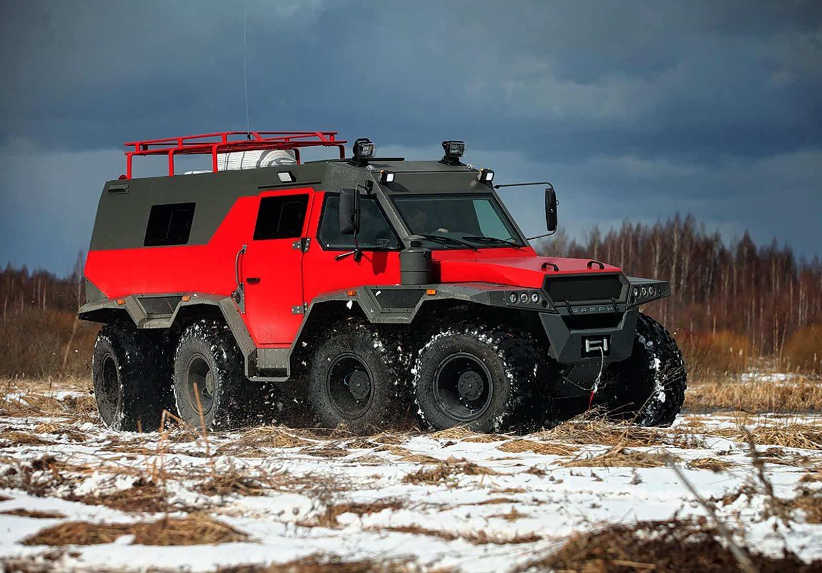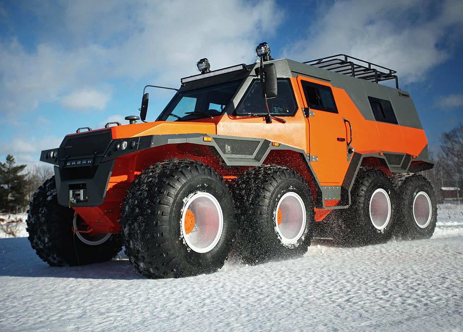 Shaman这款越野车同样来自俄罗斯,它与常规车辆最大的不同就在于它有八个车轮并且全轮驱动,其中前面四个车轮还可以转向,让这台大车有着不错的灵活机动性。Shaman的动力来自一台3.0L依维柯柴油发动机,八轮驱动的设计让它在陆地上很难陷住,同时,Shaman的车身密封性做得很好,趟过过深河不会轻易进水沉没。强大的越野通过能力,让Shaman在广袤的俄罗斯冰原冻土上也能如履平地。