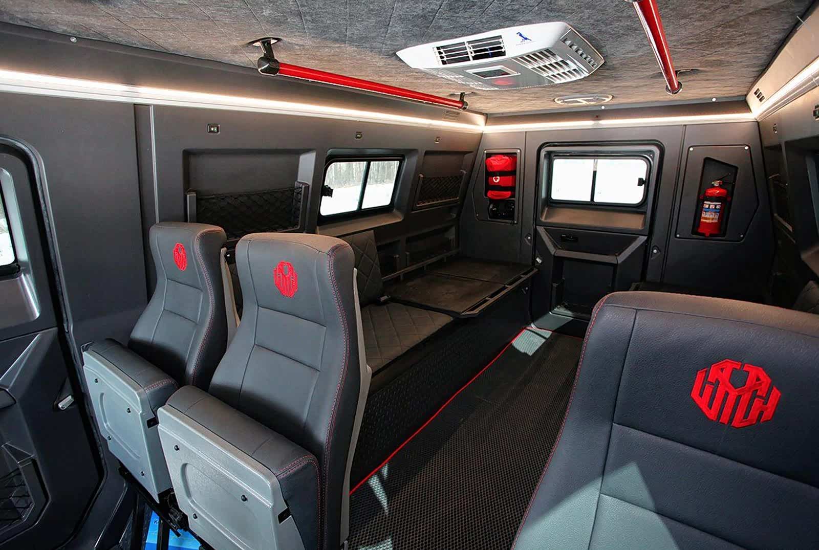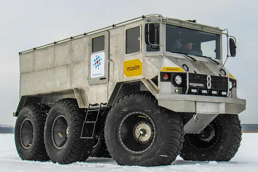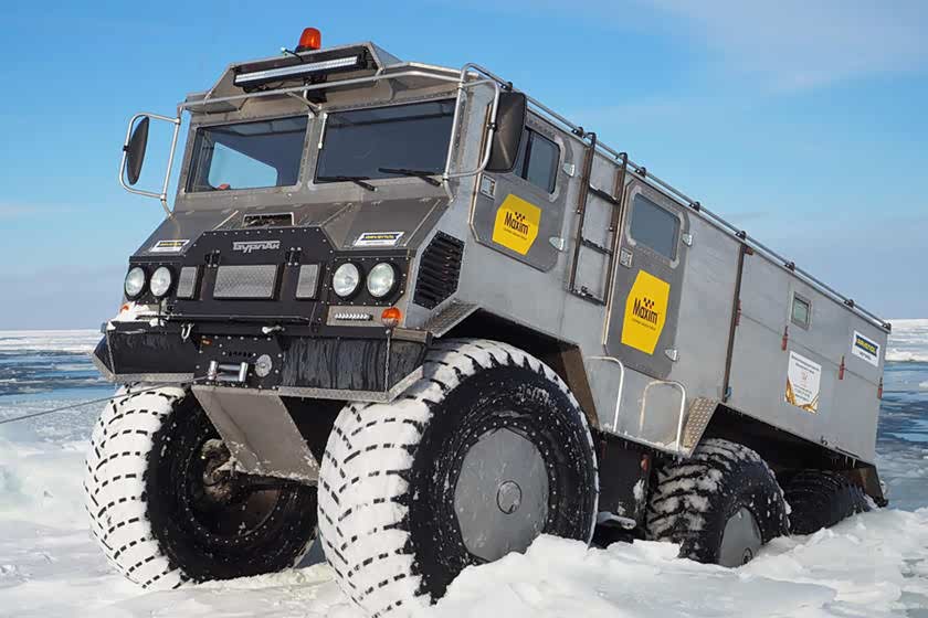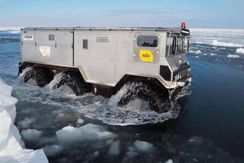 Burlack 6x6这个庞然大物来自俄罗斯,它是基于前苏联BTR-60装甲运兵车改造的六轮驱动卡车,主要用于冬季往返俄罗斯和北极。车内密封性非常好,内部还设有厨房和卫生间,最多可供10人乘坐。当它压碎冰面掉进水里时,Burlack 6x6还能在水里漂浮,用车尾的螺旋桨继续前进。为了提升极端环境下的车辆可靠性,这台车还提供一项特殊功能:人员可以在车内维修发动机,无需担心车辆在北极抛锚。