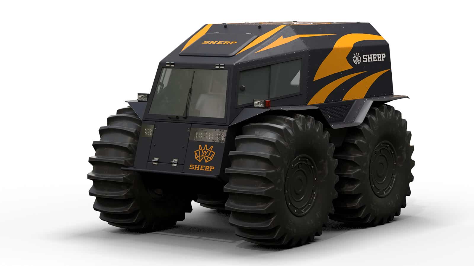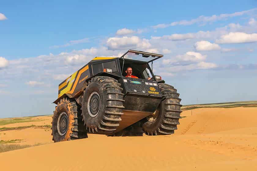 Sherp ATV这款水陆两栖全地形车就是为越野而生,它由俄罗斯工程师设计,特别适合穿越沙漠、沼泽、雨林、冻土、雪原等恶劣地形,在俄罗斯、北美、澳洲、非洲都能找到它的身影。Sherp ATV的外形窄小,而且设计时速最高只有40km/h,但它的越野能力真的不容小觑。越野精髓在于它中空的车身和四只巨大的车轮,转弯掉头依靠两边车轮的转速差来实现,行驶在非铺装路面上异常灵活。当遇到河流和沼泽时,这部车可以完全浮在水面上,轮胎花纹可以当做船桨,拨动水面向前推进,轻松走过普通越野车不敢挑战的地形。