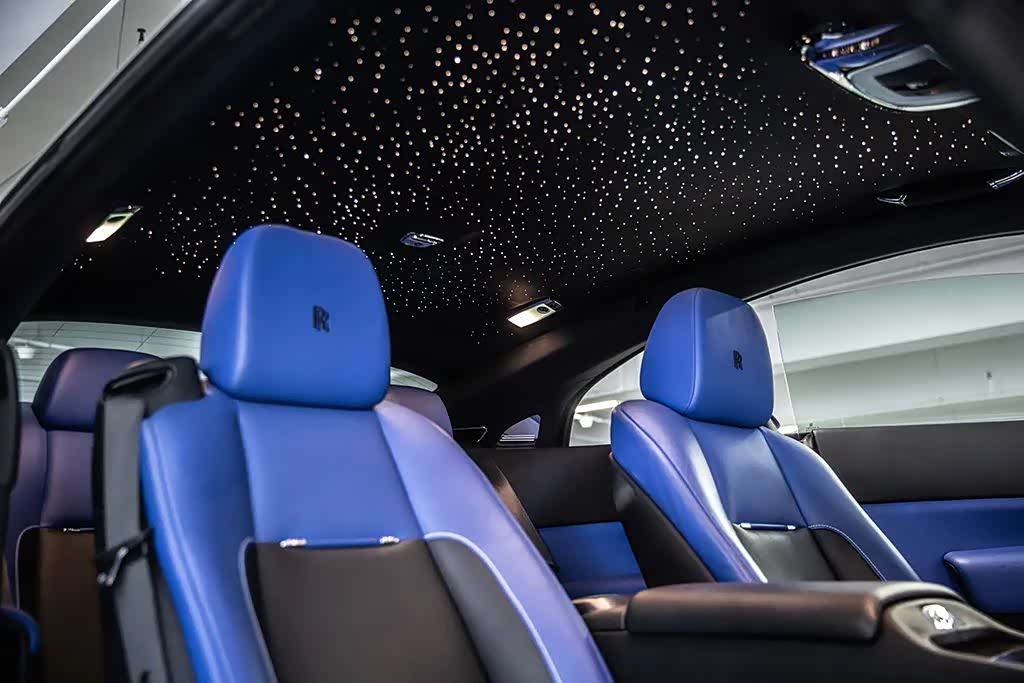 “星空车顶”是劳斯莱斯著名的奢华配置,目的只有一个,那就是为了营造豪华感受。“星空顶”其实是将许多发光纤维束藏在了打孔真皮车顶内部,光靠触摸是感受不到的,并且可以对亮度进行控制,控制按钮安置在传统天窗开关位置。客户还可以选配“流星顶”,车顶会不定时的随机产生好似流行划过的效果,据传言选装费用为20万起。