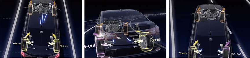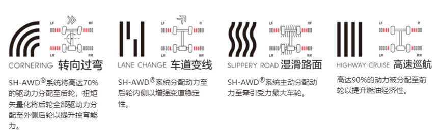 SH-AWD®超级四轮驱动力自由控制系统作为补充的敏捷操纵辅助系统,该系统采用ABS防抱死制动系统,可单独控制左前轮或右前轮的刹车控制,以改善过弯时的跟踪能力和平衡性。在转弯时让外侧后轮的转速快于前轴,从而通过扭矩分配来产生横摆力矩,帮助车辆转弯,避免转向扭矩不足,提高可控性。由于前后轮转弯力道分配更均匀,从而无论是潮湿还是干燥道路上都可以增加整体的转弯动力,使车辆快速过弯的表现更好。
