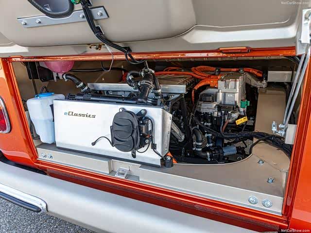 在这辆1966年T1 Samba Bus进化为e-BULLI的改造过程中,留下了经典T1的车体结构与底盘、传动布局,透过移除原有的后制水平对卧引擎,改搭平板式的底盘电池,动力系统与电动马达设置于车尾,也就是T1水平对卧引擎所在之处,也同样保留后轮驱动的设定。