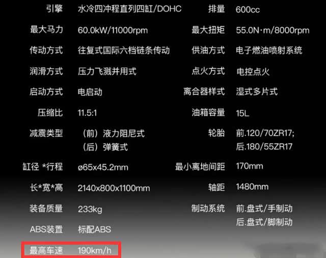 动力方面,仍然采用一款实际排量为600cc级别的四缸发动机,从官方所公布的数据当中,这款发动机的最大功率达到了60kw,最大扭矩55Nm,动力在同级别四缸车型当中并不算特别出众,但这款车最大的亮点应该就是声浪表现十分浑厚有节奏。除此之外,这款车的极速表现也是非常的出色,在官方所公布的数据当中达到了190km,十分硬核。