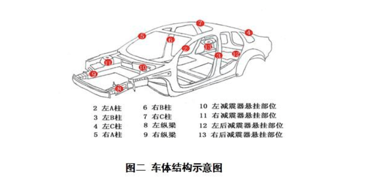 参照图二所示车体部位,按照表二要求检查车辆外观,判别车辆是否发生过碰撞、火烧,确定车体结构是完好无损或者有事故痕迹;