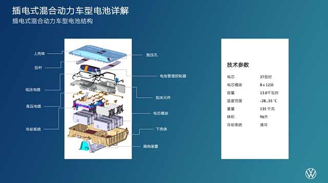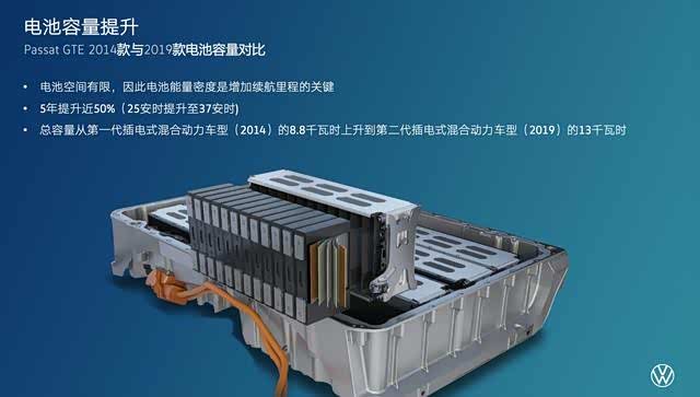 高压电池的设计,与第一代Golf GTE的电池设计应用了相同的原则。大众采用锂离子电池,12块电芯被集成在一个电池模块中,8个电池模块构成整个电池。所以这个电池里共有96个电芯,电芯容量为37安时,整个电池容量为13千瓦时。而相应的,其续航里程也得到提升,包括帕萨特GTE、高尔夫GTE等车型的纯电吕航里程都已接近60公里。