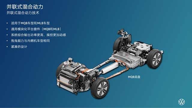 在变速箱方面,大众使用了配备了永磁同步电机的DQ400E变速箱。电机与分离式离合器以及双离合变速箱高度集成,形成非常紧凑的模块结构。其特点是电动机位于发动机与变速箱中间靠变速箱一侧。因为和发动机之间有离合器,因此可以单独驱动车轮;在动能回收时也可以切断与发动机的连接。且由于电机与驱动轴之间可以有传动比,因此不需要太大的扭矩,可以降低成本和电机的体积。