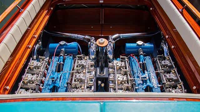 透过船舱,我们可以看到两台经典的兰博基尼发动机,相比游艇上豪华的实木和真皮更加亮眼。同时也正是它们的存在让这艘特别的Aquarama游艇成为了该系列中最快的那一艘。并且这艘游艇已经正是被兰博基尼收录,成为了兰博基尼品牌历史上的一个经典收藏品。