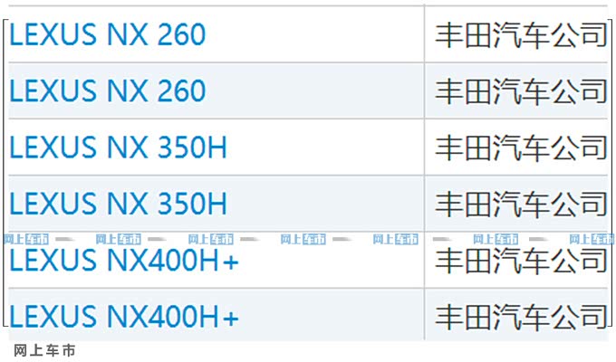 雷克萨斯NX目前国内在售三个动力版本,代号分别为NX 200、NX 300以及NX 300H。网上车市从商标局获悉,丰田已经在国内注册了“LEXUS NX 260”、“LEXUS NX 350H”以及“LEXUS NX 400H+”三个新商标。雷克萨斯车型后的数字尾标代表了动力系统,例如NX 260就表示将采用2.5L汽油发动机,而350H和400H+尚未在此前的车型中出现过,预计为动力更强的混动系统。其中,400H+有望为插电混动车型。