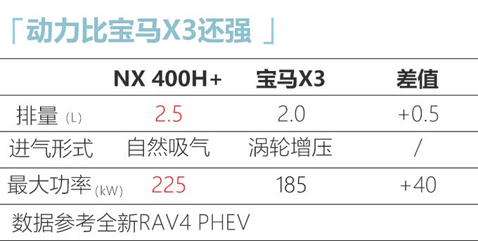最后是NX 400H+,在混动版后面加入了“+”符号,预计为插电混动式动力,上市后也将成为NX车系动力最强的版本。目前丰田汽车仅有全新RAV4推出了插电混动版,由于NX换代后会与全新RAV4同平台打造,且两款产品尺寸相近,预计NX 400H+也会采用相同的2.5L插电混动系统。