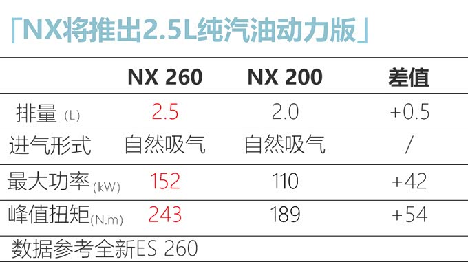 目前雷克萨斯NX已经到了本代车型的生命末期,根据海外曝光的最新规划,NX预计在2021年正式换代,将会基于TNGA架构打造,而动力总成也会有所更新。首先是NX 260,目前全新ES就上市了260版本车型,采用2.5L汽油发动机,匹配8AT变速箱。而NX 260大概率会与全新ES保持一致,采用2.5L+8AT的组合。