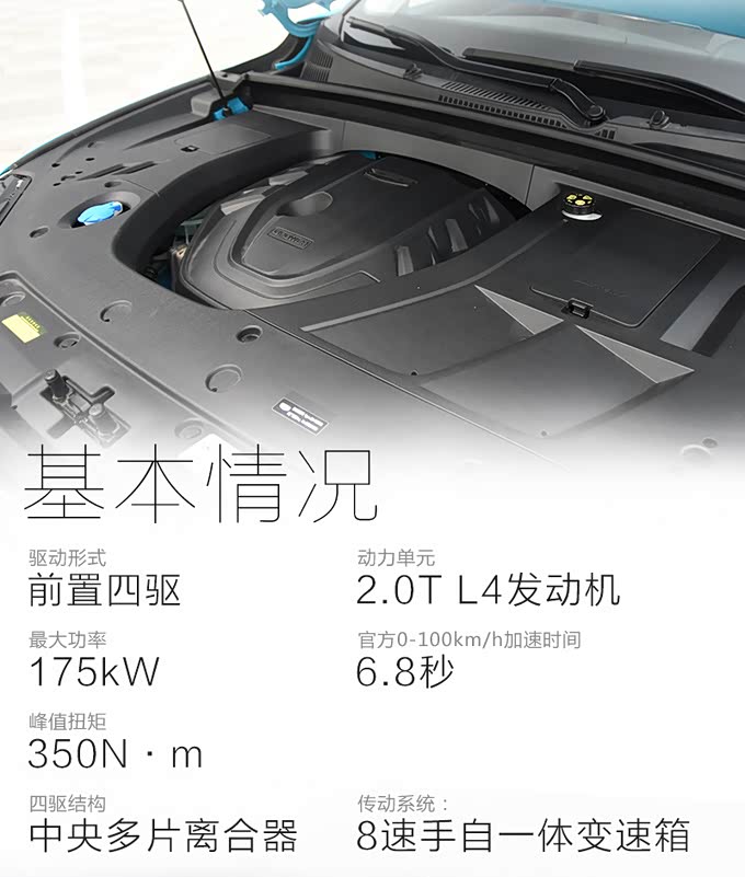 老规矩,我们先来看一下动力数据,吉利星越魅影骑士版搭载了一台代号为JLH-4G20TDB的2.0L涡轮增压发动机,最大功率为175kW,峰值扭矩350N·m,传动系统方面,配备来自爱信的8速手自一体变速箱,底盘部分,采用前麦弗逊式独立悬架,后多连杆式独立悬架,并配备了博格华纳第五代适时四驱系统。