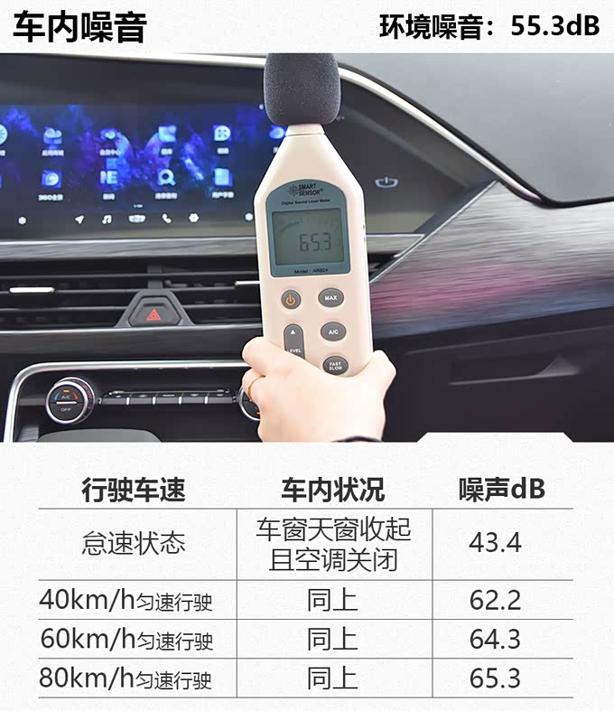 为了模拟日常用车场景,我们分别在车辆时速40km/h、60km/h及80km/h的状态下使用希玛AR814型号的高精度声级计进行了实际测试,通过我们对车内噪声采集的读数来看,吉利星越魅影骑士版在车速40km/h、60km/h以及80km/h时,车内前排读数分别为62.2dB、64.3dB以及65.3dB,虽然发动机噪音被有效抑制,但来自路面及轮胎的噪音还是被传递进了车内。