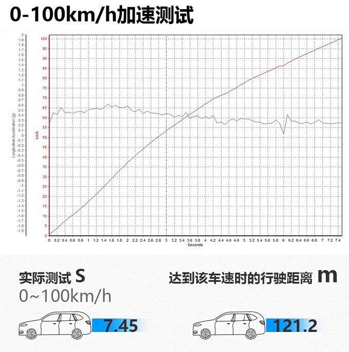 对于车辆的动力性能,国内的消费者比较看重的就是0-100km/h的加速时间。经过我们实际测试,吉利星越魅影骑士版最终的0-100km/h加速成绩为7.45s,破百距离为121.2m,G值在一开始便可以达到0.6g,同时整个动力输出状态能够保持平稳,并没有较大起伏,也就是说车辆变速箱换挡极为平顺。我们的实测的加速成绩与官方宣称的6.8秒有些出入,导致此结果因素诸多,如车辆状态、轮胎磨损、天气因素等等,7.45s的加速成绩对于这个级别的轿跑SUV而言已经算是十分出色了。