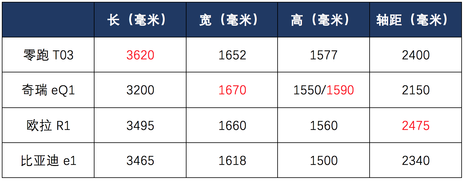 零跑T03的长宽高分别为3620/1652/1577毫米,轴距为2400毫米。通过对比数据可以看到,零跑T03的长度和轴距在微型车里处于前列,高度也算得上领先,要超过不带行李架版本的奇瑞eQ1。零跑在规划中是将车内空间放在核心位置,前后排乘客的舒适度都能得到保证,而且新车的定义是5门4座车型,后排仅设计2个座位,空间也不显拥挤。