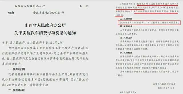 奖励要求:山西省消费者新购买的由本省整车企业生产的、并在省内进行机动车注册登记的整车产品(传统燃油车需满足“国六”排放标准),给予购置车辆一次性消费奖励。