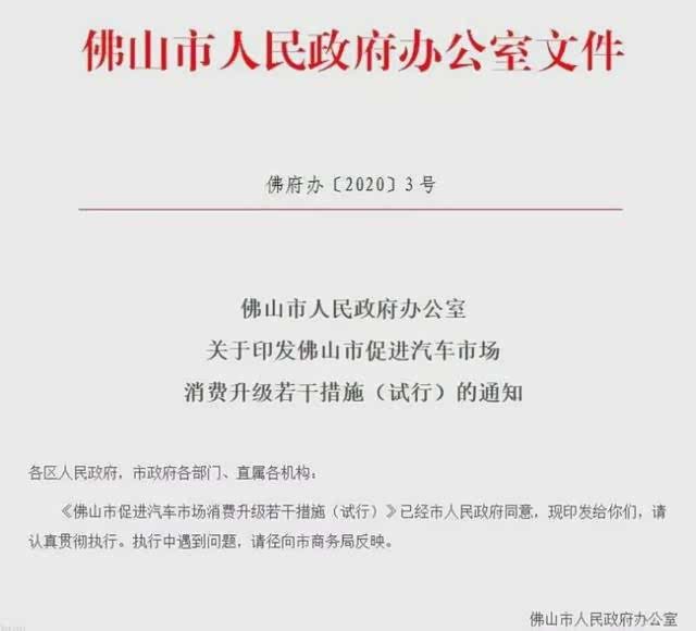 奖励标准:1、佛山号牌车主凭旧车售卖发票或汽车报废注销证明购买新车,每辆给予3000元补助。
