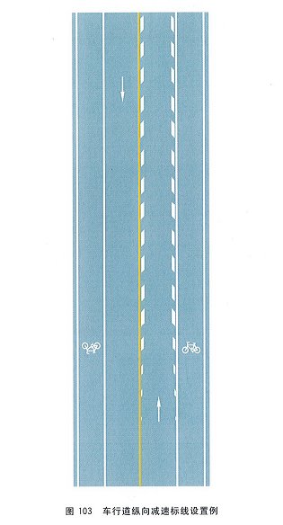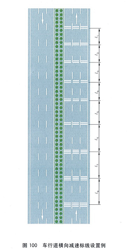 车行道减速标线设置于弯路、坡路、隧道洞口前、长下坡路段及其他需要减速的路段前或路段中的机动车行车道内,分为车行道横向减速标线和车行道纵向减速标线,用于警告驾驶人前方应减速慢行。