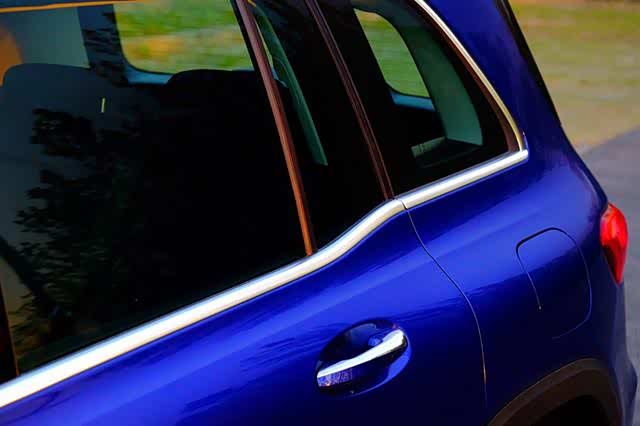 侧面这段相比之下“比较温柔”的折线,是奔驰SUV全系中独有的设计。作用是将车尾的视觉效果提高、逐渐收紧,让“直男风”的侧面设计有了层次感,同时与较低的车头设计配合,让GLB看上去有一种冲劲。