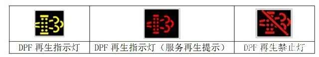 DPF 灯包含 DPF 再生指示灯和 DPF 再生禁止灯,灯的显示形式主要为黄色闪烁、常亮和红色。
