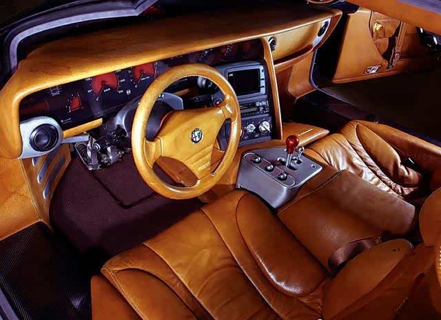 全铝车身,碳纤维框架,一个简易的可拆卸顶棚。3.0双涡轮V6可以爆发400匹马力,6档手动变速箱可以把这台车在4秒内从0拉到100km的时速。当时的阿尔法·罗密欧江河日下,你不能奢望这个企业还有钱来做这种中置超跑,所以这个项目只能是一个概念。