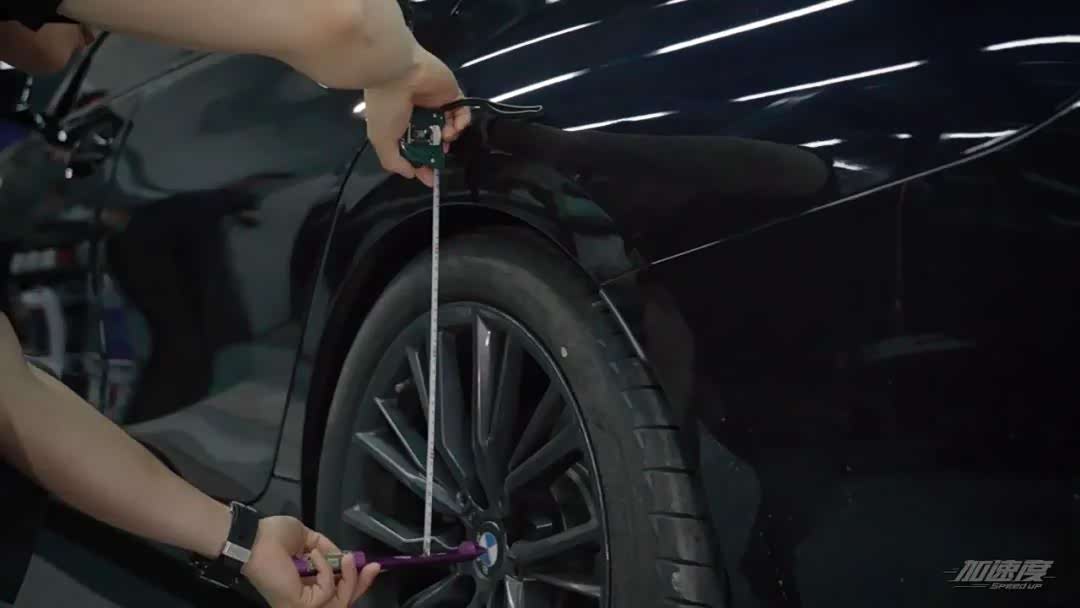 第一步我们先需要确保车辆胎压的一致,并在水平的地面上测量原车高度并记录,KW高度测量方法和宝马维修手册上的一致,都是测量从轮毂中心到翼子板的距离。