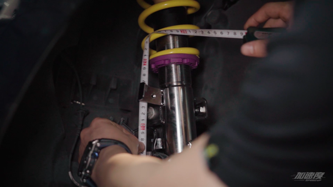 这里有个比较省力的方法,我们可以根据所需车高,利用特制表格预先计算出弹簧底座高度,避免安装出来高度不对再次返工。提前调好高度用绿漆笔做好记号,保证安装的准确。麦弗逊需要上车之后才能测量高度。