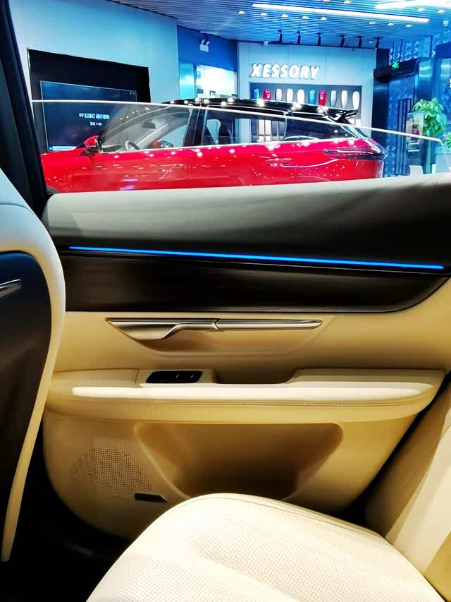 后排车门上蓝色的灯光线条,和中控台的蓝光互相呼应。