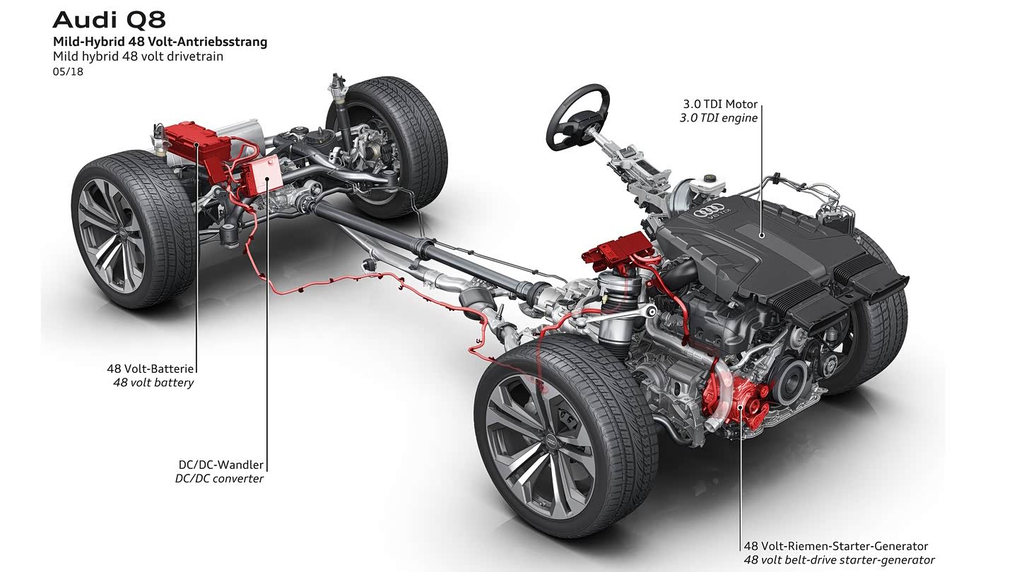 奥迪Q8不是奥迪第一款搭载48V轻混系统的车型,更早上市的全新一代奥迪A8L、A6L也同样搭载这套3.0T+48V的组合。这款系统在原有12V冷启动机系统的基础上加入了48V的BSG电机,用于实现与发动机直连的自动热启停,能够平稳的在发动机具备一定转速的情况下实现热启动,也就是滑行熄火,给油就无声无息的启动。在滑行时,BSG电机会充当发电机角色,给电池充电,并且将电量用于加速时给发动机提供一臂之力。