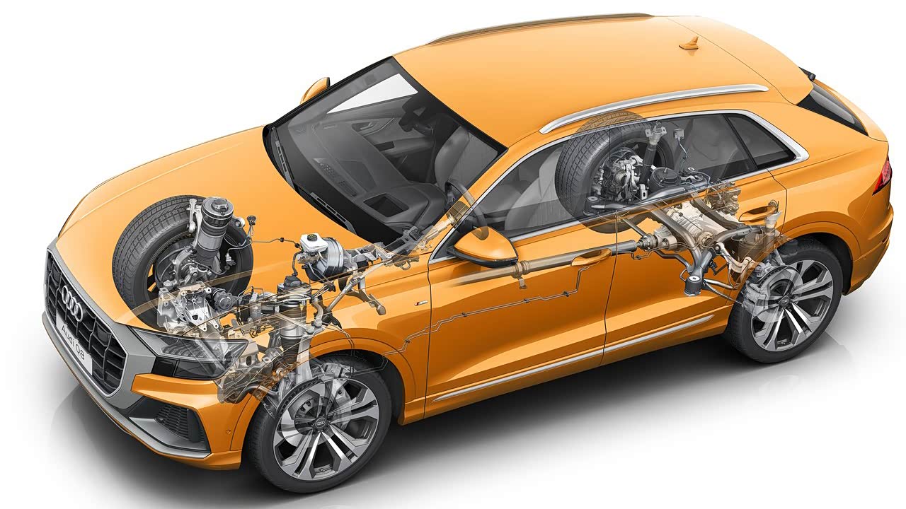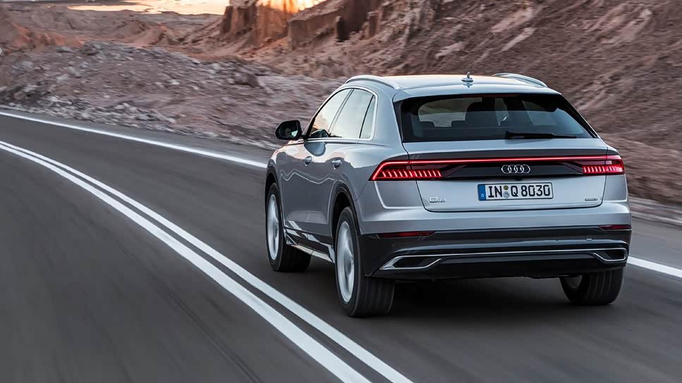 动力及科技层面,奥迪Q8搭载2.0T和3.0T+48V轻混两款动力总成,匹配8AT变速箱,全系搭载quattro全时四驱系统。