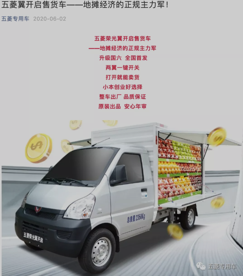当然,最骚的还是五菱这家汽车厂商,直接推出了一款专为摆摊而生的售货车,国六标准,两翼电动一键开关,号称这才是地摊经济的正规主力军,这波操作不得不服。
