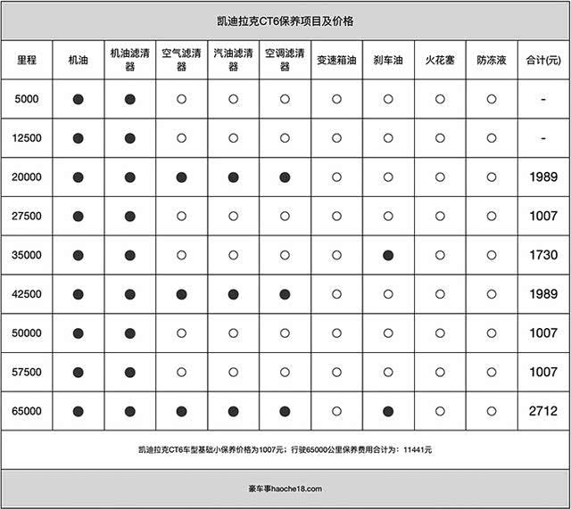 其中最贵的一次保养是65000公里时的大保养,价格为2712元,项目较多包括了汽油滤芯、刹车油几个项目。另外凯迪拉克厂商还建议每次保养使用一瓶原厂的燃油添加剂,价格个202元/瓶。