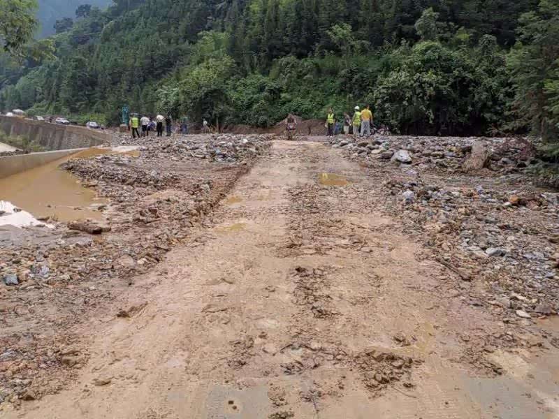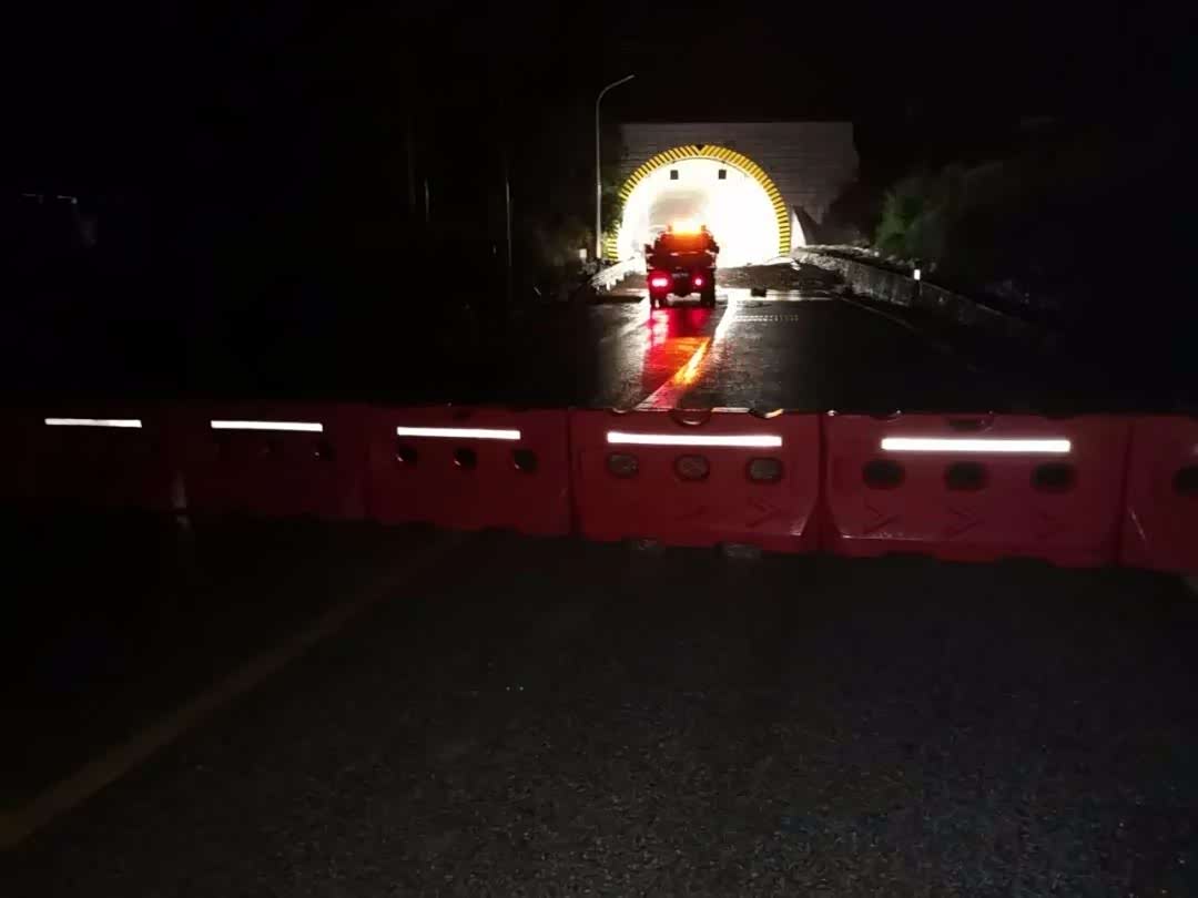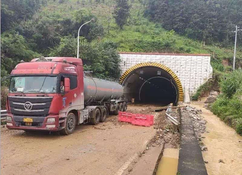 2020年6月9日3时20分,受强降雨影响,南丹公路养护中心管养的S303线(融安至下老)K318+800-K319.5)六卡隧道 路段,因山洪爆发致泥石流淹没道路交通受阻中断,经南丹公路养护中心组织机械、人员全力清理泥石流,于6月9日上午10点30分恢复半幅路面通车,现场施工人员在该路段两端设置警示标志,提醒过往车辆小心行驶。