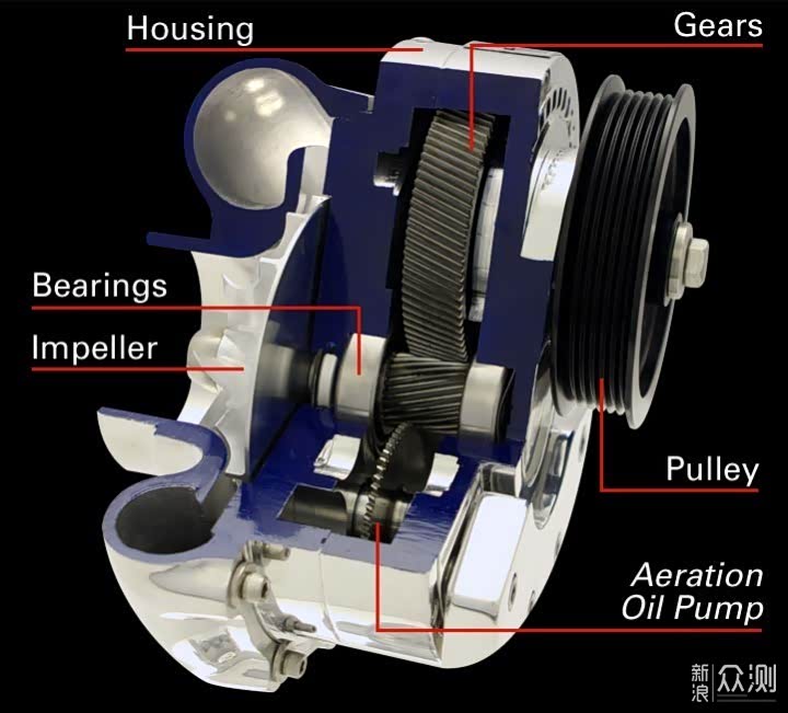 最后是这种比较安静的离心式增压器,看起来很像一个涡轮增压,只不过涡轮增压是由废弃驱动的,这种是皮带轮带动一组增速齿轮驱动叶轮增压的。