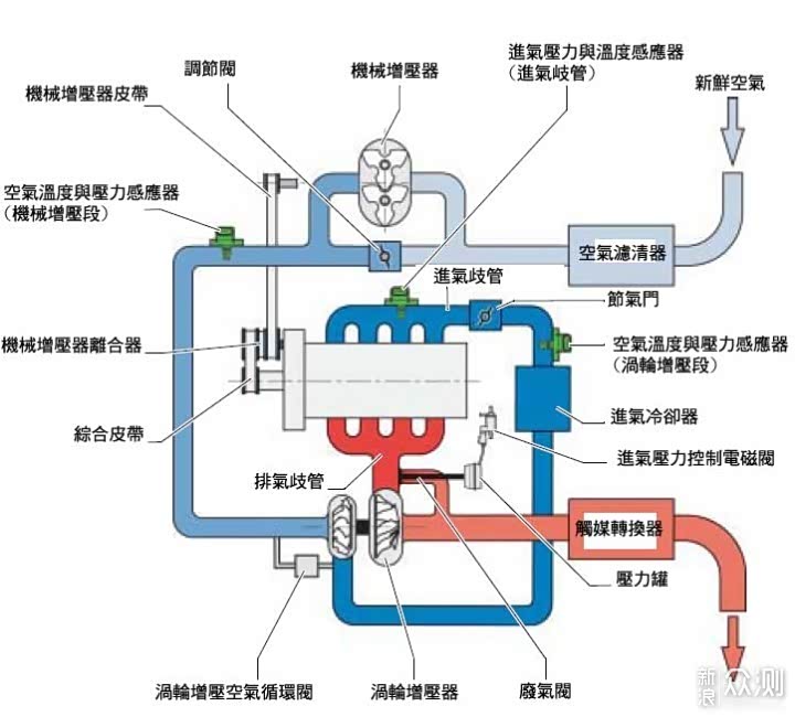 所以对于全速域方式的探索,导致了一些奇葩发动机的出现,比如大众EA211 1.4 r4 16v tsi,这台发动机将涡轮和机增结合到了一起。(好吧大众发动机编号太乱了,总之就是高尔夫5代gt上那一台)