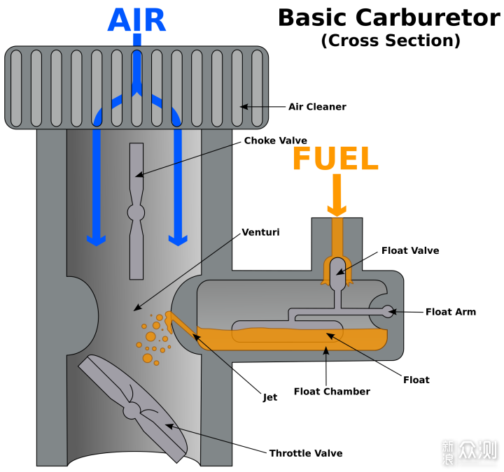 化油器原理其实很简单,一个伯努利方程,一个文丘里管就可以解释清楚。然而,作为统治了汽车供油系统近百年的产品,他也发展出了复杂的结构和分类,比如按吸气方式分有上吸下吸侧吸,节气门有旋转式升降式CV式,系统又分主油系,怠速系,加速系,启动系等等,所有和油相关的功能都被以粗暴的机械方式集成在这么一个小小的元件上。