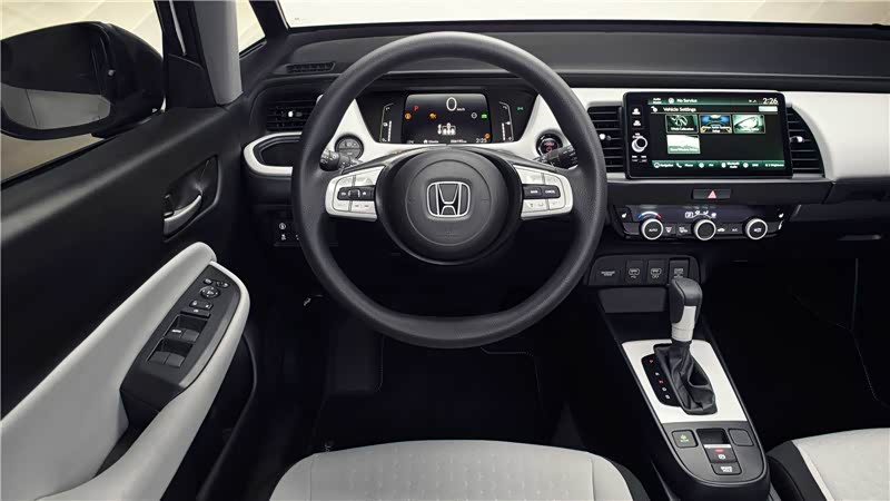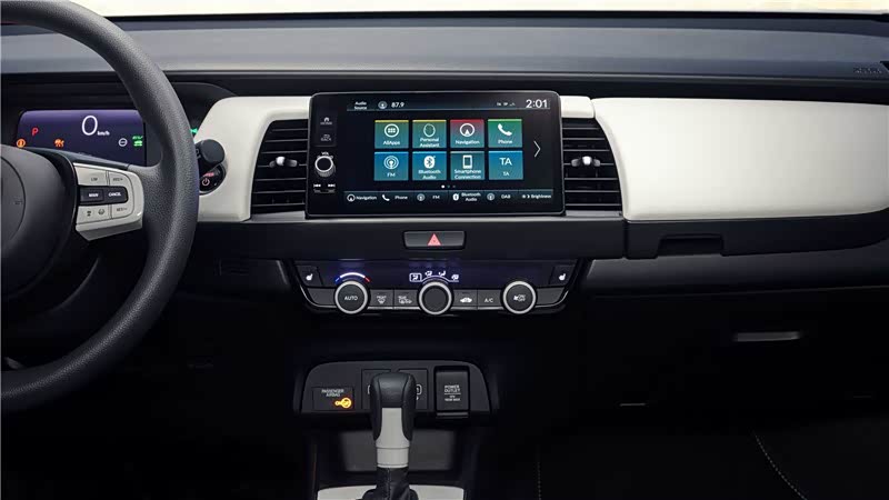 第四代飞度中控台采用了更简洁、更凸显空间感的横向布局,国产车型基本沿用了这一设计,但取消了电子手刹、Autohold和更为素雅家用的浅色内饰。