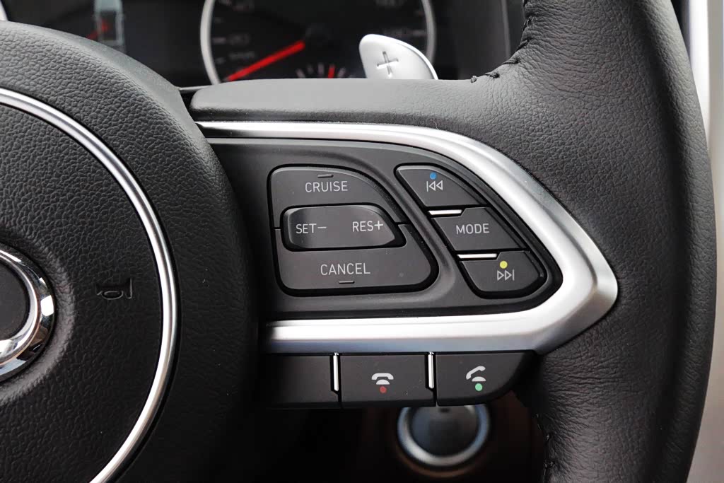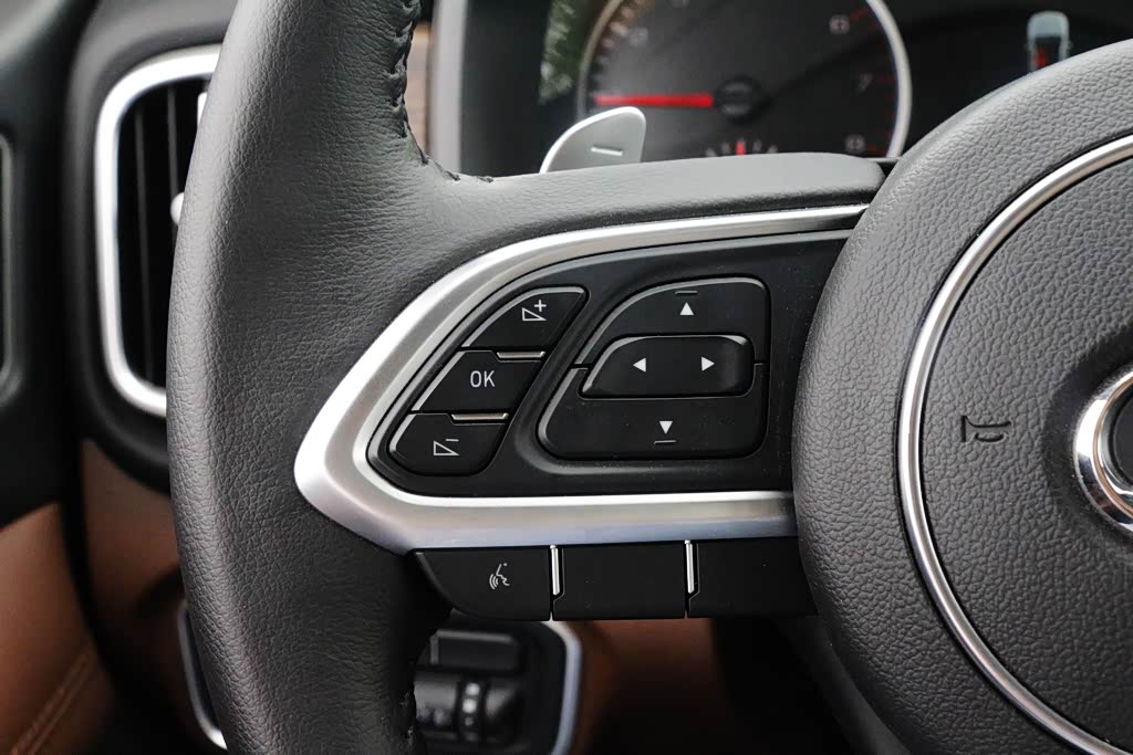 真皮包裹的多功能方向盘握感适中,功能按键分列在两侧,可控制音响、蓝牙等不同功能,并带有换挡拨片,符合这台车运动款的定位。