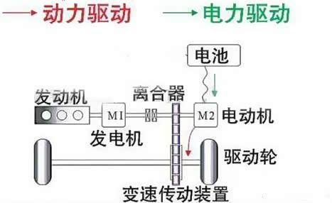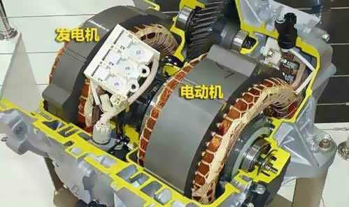 知识点:初代F3DM插电混动汽车的CVT并不是传统类型,不采用低级的带轮钢带传动模式。其内部结构集成了两台电动机:M1电机为发电电机,与内燃机串联控制一组齿轮组;功能为行驶中发电实现增程驾驶模式,其次在车辆中高速驾驶时辅助输出动力。M2电机为驱动电机,作用为单独驱动车辆以纯电模式行驶,在混动模式中合并输出,结构特点参考下图。