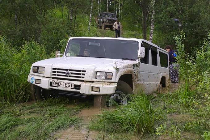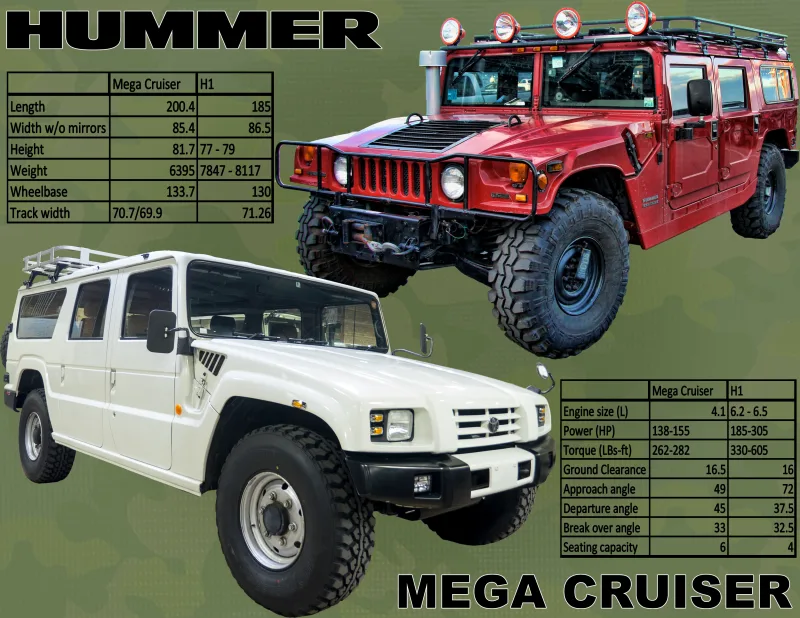 超级巡洋舰尺寸的确很'Mega'(巨大),车长5315mm,车宽2177mm,车高2055m,轴距长达3396mm,整体比美国悍马H1都大一圈。车辆自重2901公斤,有效载荷750公斤。动力来自一台4.1L四缸涡轮柴油发动机,最大功率仅为150马力,但这台发动机有着专为适应越野环境的特殊调校,非常注重低转速下的高扭矩输出。动力经过4速自动变速箱以及前中后三个带锁差速器,最终传导至四个车轮。