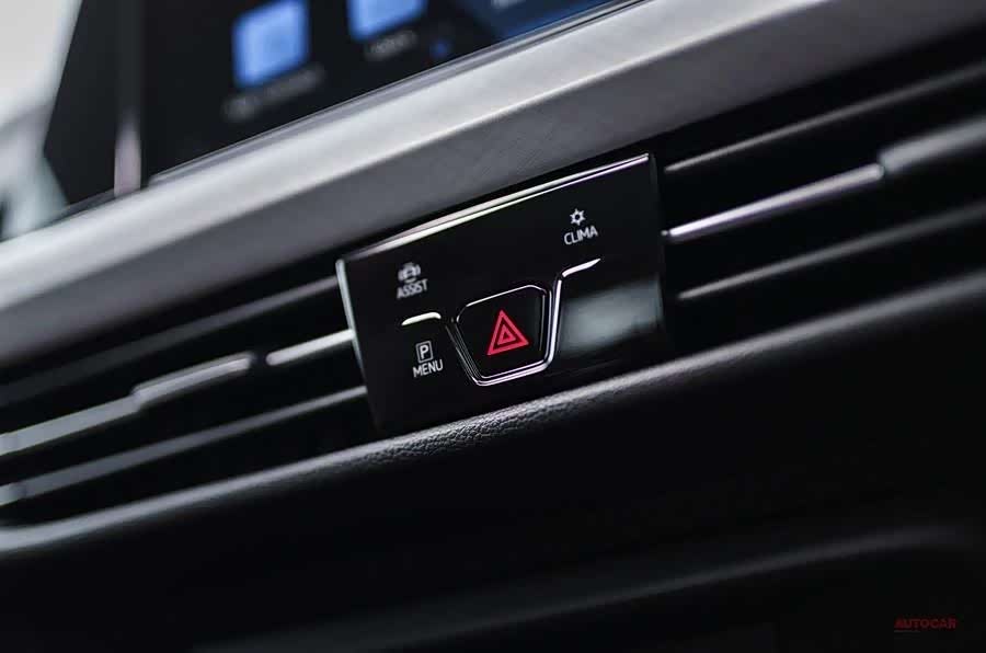 空调出风口中央的双闪按钮旁边能够看到辅助驾驶、空调操作、停车菜单、以及一个空白按钮的操作区。更高配置的车型这里的按钮区域应该是被填满的了。