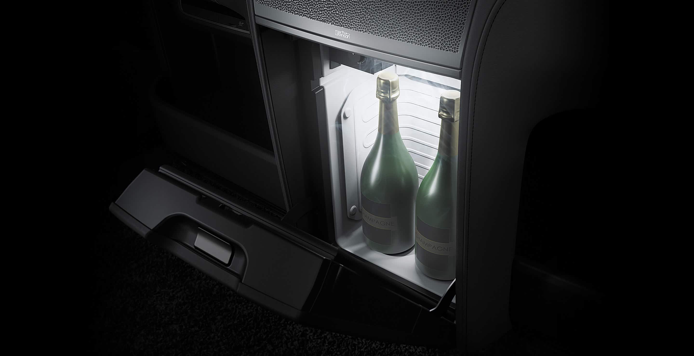 来来来,四座版本的后排与前排之间加了隔断,没错,就是装修房子时咱们说的隔断。这隔断墙上装了一个26英寸的车载电视、可容纳2瓶750ml红酒的车载冰箱,座椅按摩、调节面板这种三十万级别MPV都有的东西我都懒得说了;19扬声器的马克莱文森音响、耳机接口and 6个USB接口。
