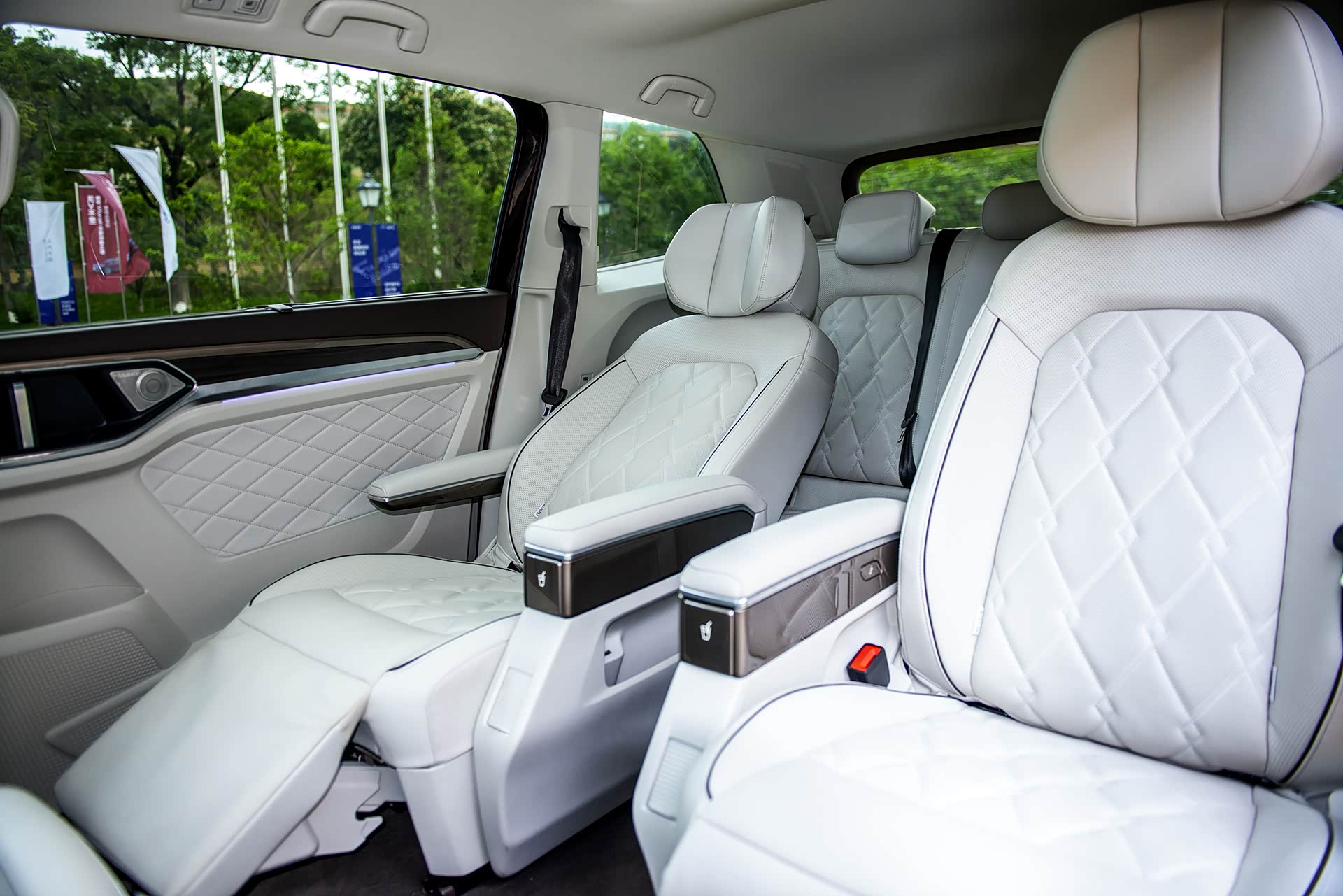 车尾造型同样平稳为主,IQ-LIGHT的尾灯在启动时同样会进行一套自检程序,视觉效果是真的挺漂亮,体现出的质感与科技性很亮眼了。一条镀铬条横贯两侧尾灯,在视觉上为尾部营造了横向宽体的效果。下包围镶嵌的横贯式镀铬条,镀铬条两侧是多边形的排气布局,造型稳妥。要表扬一下威然的玻璃选择,首先高配车型第一排、第二排都是双层夹胶静音玻璃,效果非常不错;再有,第二排隐私玻璃作为商务车型应该给个赞。