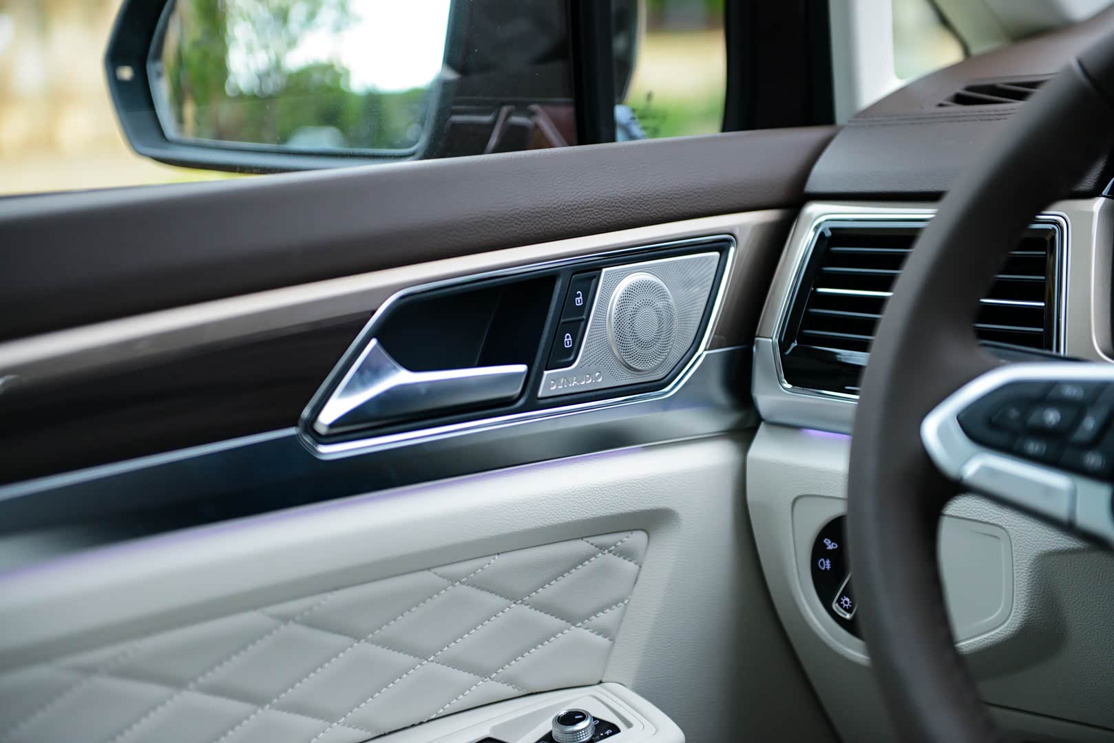 整个内部驾驶舱的质感与其他大众车型截然不同,开帕萨特的肯定满脸问号“都是大众,为啥面包车这么豪华”。车门处摸得到的地方几乎都是皮革,而且的菱形造型,摸上去温润柔和。仔细看车门,丹拿音响的标识相当耀眼,这套音响的人声还原效果极佳,怎么说呢,高音甜、中音准、低音沉,一句话就是通透。
