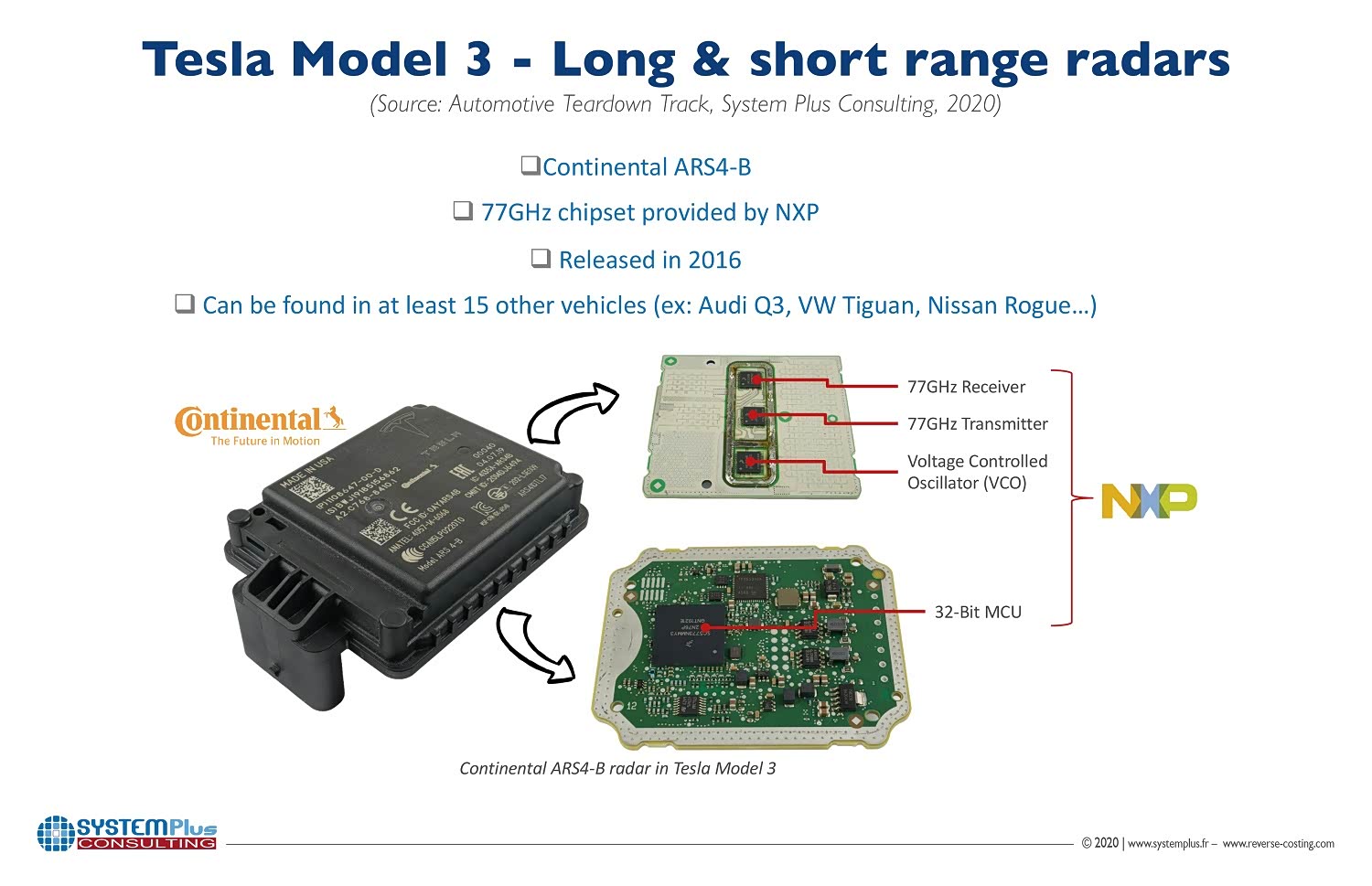 特斯拉选择了大陆的产品—ARS4-B。这款中长距离雷达采用的是77GHz芯片组和恩智浦提供的32位的MCU。这里需要说明一下,尽管目前联发科和德州仪器(EDX)等在内的多家芯片公司声称进入汽车雷达市场,且都看似来势汹汹,但恩智浦和英飞凌仍是无可争议的两大芯片公司,也是目前的行业领先者。而对于大陆ARS4-B雷达,你至少可以在15款车上发现它的影子,其中包括奥迪Q3,大众Tiguan,日产奇骏等。