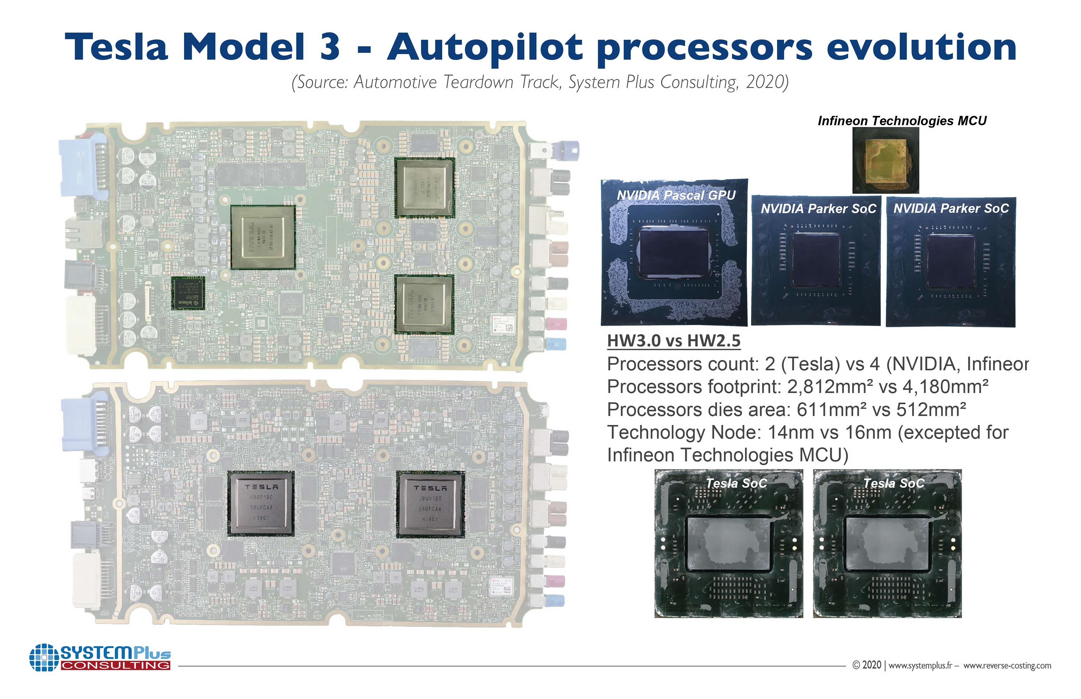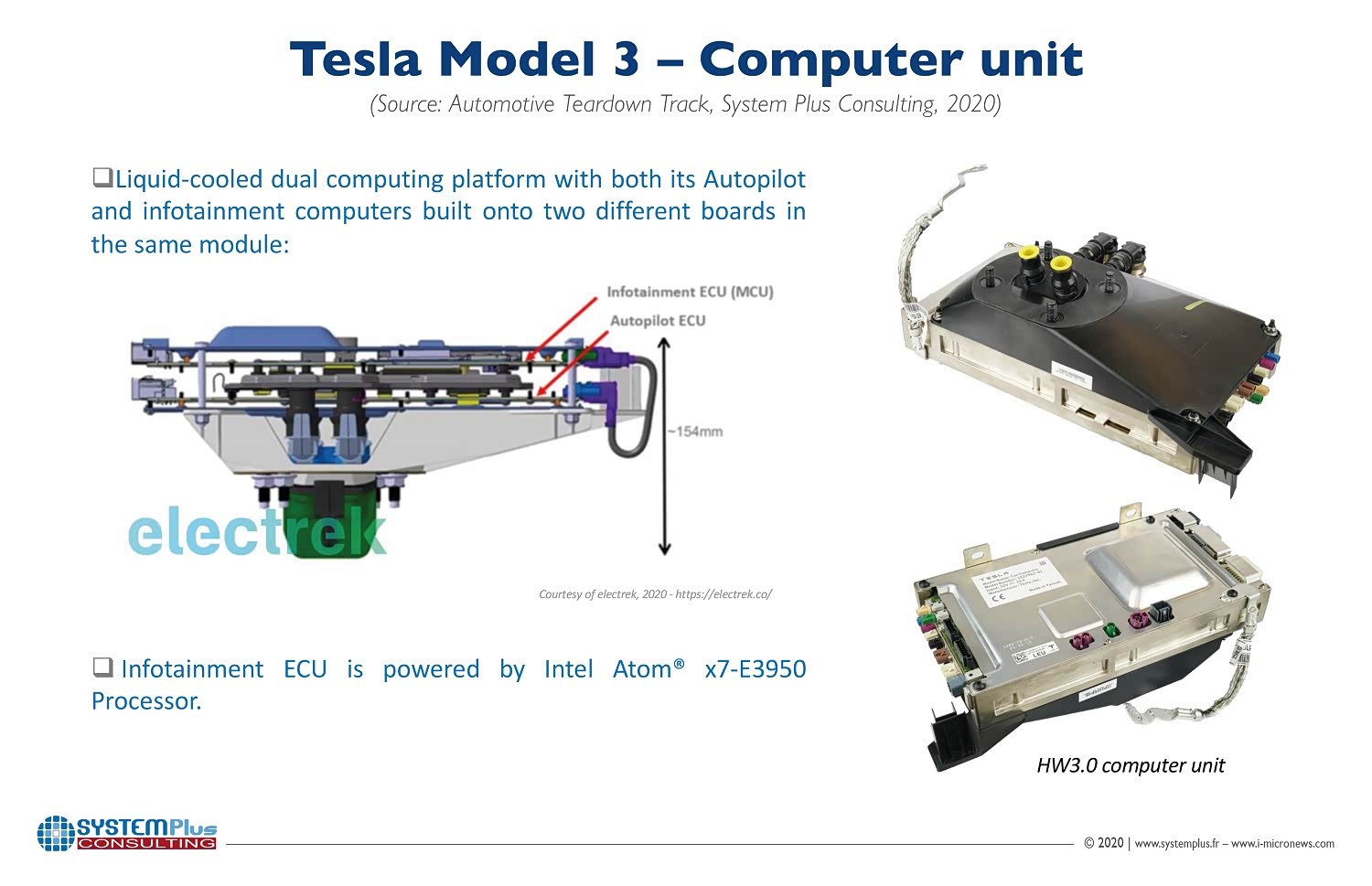 特斯拉已经开发出一个定制的"液冷双核计算平台",包括其自动驾驶和一般的车机信息处理。简单点说,就是两者被整合到一个模组中了。一边是信息娱乐的ECU,另一边是则负责自动驾驶的ECU。而且在最初HW2.5中,特斯拉的Autopilot仍是Nvidia的SoCs和GPU。钢铁侠即使再天才,也不能事事都靠自研。特斯拉集成了来自多家制造商的完整模块:Nvidia的高性能集成电路(用于GPU)、英特尔(用于处理器)、恩智浦和英飞凌(用于微控制器)、Micron技术、三星和 SK Hynix(用于存储器)和用于音频放大器的STMicroElectronics等。