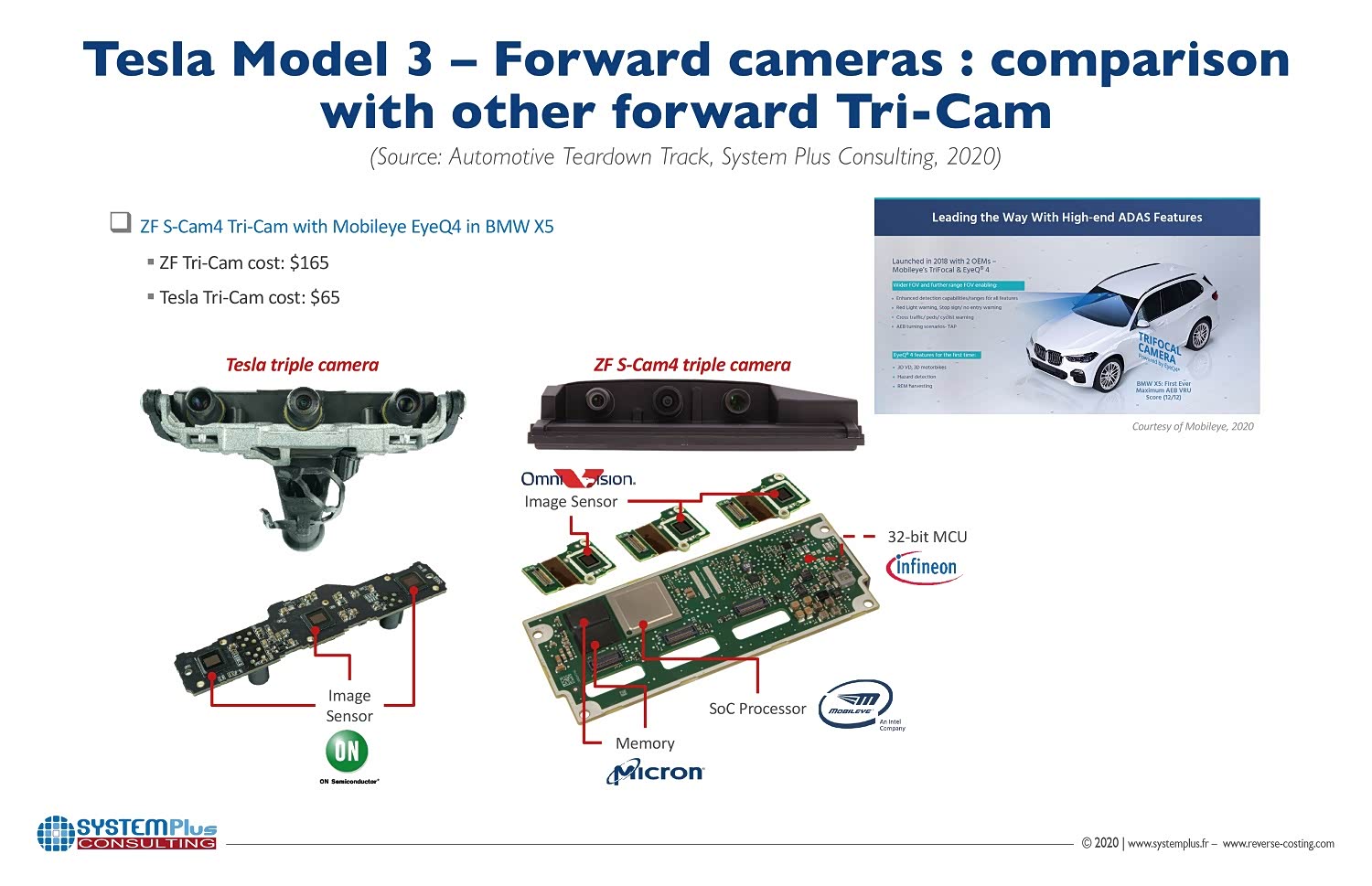 Tesla的前向摄像头系统均使用的是On Semi AR0136A CMOS图像传感器,单个像素尺寸为 3.75 um,分辨率为 1280×960 1.2Mp,视觉处理器则是特斯拉自家的。为了对比,他们找了采埃孚的另一款三摄模组—S-Cam4。S-Cam4配备Omnivision CMOS图像传感器和Mobileye EyeQ4处理器。另一方面,特斯拉的封装工艺与宝马的不同,就像下述图片展示的那样。宝马更偏向于将不同的传感器放在不同的PCB上,而特斯拉则和它相反,前向模组的将所有的PCB放在了一起。据他们分析,这种不需要后处理的方式更是进一步的降低了成本。采埃孚的三摄系统成本可能需要165美元,而特斯拉的或许仅需要65美元。