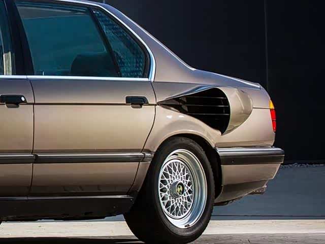 该车为E32代的宝马750iL,原车就搭载了V-12引擎,而换装V-16引擎之后该车被命名为767iL。由于新的发动机体积明显比V-12引擎要大,所以宝马的工程师们只能将冷却系统移至了后备箱中,并在后翼子板位置设计了一个大尺寸的冷却通风口。