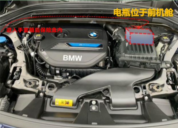 终于在试验了所有的方法后,确定了是因为插电混动版本的X1保险盒电路与普通燃油版不同,提供长电的保险会在锁车一段时间后断电,而记录仪没有内置电池维持时间,所以摆在面前的就只有采取原始的方法:那就是从电瓶取电。(小插曲:众所周知,宝马为了50:50车身平衡,电瓶一直都是放在后备箱做配重,但是我和小哥找遍了也没发现电瓶的踪迹。最终还是在前机舱找到了...不过这也方便接电了,如果从后备箱引,那要多长线,拆多少饰条啊)